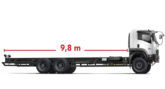 Daya angkut maksimal, dengan cabin to end hingga 9.8m Memiliki ukuran cabin to end hingga 9.8m(pada tipe FVM U Standar maupun High Power) menjadikan Isuzu GIGA FVM kendaraan yang dapat diandalkan dan sangat mendukung aplikasi kargo yang lebih besar, dengan daya angkut maksimal dan volume yang besar (GVW 26 ton). |
